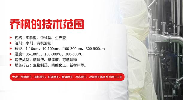 上海喬楓實業有限公司,成立于2012年,是從事噴霧干燥設備的研發設計、生產、銷售(小型噴霧干燥機實驗型噴霧干燥機,35℃低溫噴霧干燥機,有機溶劑噴霧干燥機,低溫閉式循環噴霧干燥機、超細粉末噴霧干燥機噴霧冷凍干燥機、真空噴霧干燥機、氣流噴霧干燥機,噴霧造粒干燥機離心噴霧干燥機,沸騰制粒機等)和售后于一體的綜合性公司,本公司現成為一家致力于為生物制藥、精細化工、新能源、陶瓷造粒及食品工程等領域提供全套解決方案的整線交鑰匙工程企業。